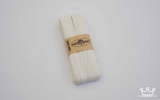 Tricot biaisband van het merk Oaki Doki, is samengesteld uit Viscose en Elastan. Het heeft een fijn geweven structuur en voelt heel zacht aan. Het is decoratief toe te passen op veel rekbare stoffen, vooral voor mouw- en halsopeningen.
