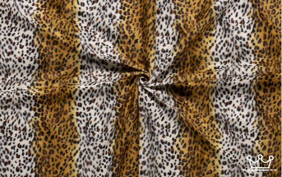 Dierenprint panter geel klein is een mooie kwaliteit Velboa. Het is een kortharige velours/nep bont. Het is dus een harige stof met een luxe uitstraling. Deze stof is gemaakt van 100% polyester en wordt machinaal gemaakt. Deze stof wordt speciaal gebruikt voor het maken van: kleding, kussens, decoratief of als bekleding voor bijvoorbeeld een hondenmand. Ook bij het theater of bij de carnaval zien we deze stof regelmatig terug.