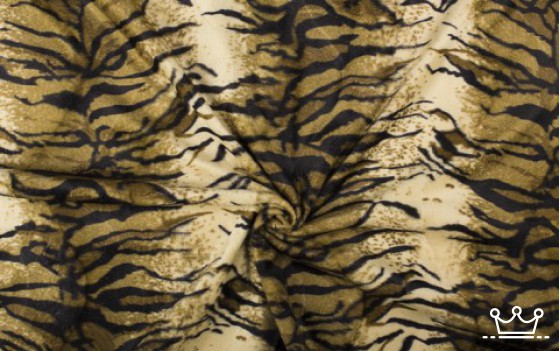 Dierenprint tijger bruin is een mooie kwaliteit Velboa. Het is een kortharige velours/nep bont. Het is dus een harige stof met een luxe uitstraling. Deze stof is gemaakt van 100% polyester en wordt machinaal gemaakt. Let op! deze stof heeft de naam tijger bruin maar heeft een beetje een groene gloed over zich!