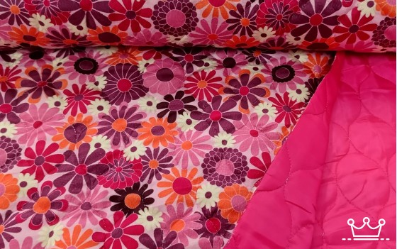 Deze gestepte stof is gevoerd met een dun laagje fiberfill. Deze stof is aan de binnenkant gevoerd, de buitenkant is een velvet stof met bloemen en de binnenkant is effen voering in de kleur fuchsia. De stof is dubbelzijdig, stevig en tegelijkertijd heerlijk zacht. Perfect voor het maken van comfortabele en warme babyjasjes, vestjes, dekentjes, bodywarmer en accessoires.