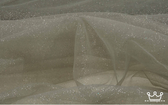 Glitter tule licht grijs is een stugge polyester stof met gaatjes wat hem doorschijnend maakt.