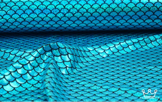 Lamee schub groot blauw is een stof met een mooie glans en schub motief die in de breedte rekbaar is. Lamee stof is gemaakt van 95% polyester en 5% spandex.