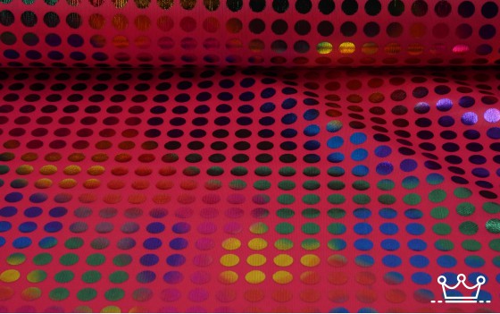 Het is een mooie soepele kwaliteit stof in een frisse felle kleur met stippen in verschillende kleuren met een glans.