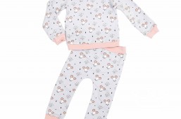 Deze pyjama is gemaakt van tricotstof met boorden van boordstof. Het shirt is voorzien van 2 drukkers aan de hals zodat baby’s hoofdje er gemakkelijk doorheen past. Het broekje heeft een boord aan de bovenkant, voorzien van elastiek en twee boordjes aan de onderkant.