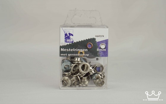 Nestelringen zilver Ø 8mm in een doosje zitten 24 nestelringen. Deze nestelringen zorgen voor een fraaie en stevige afwerking van een gat.