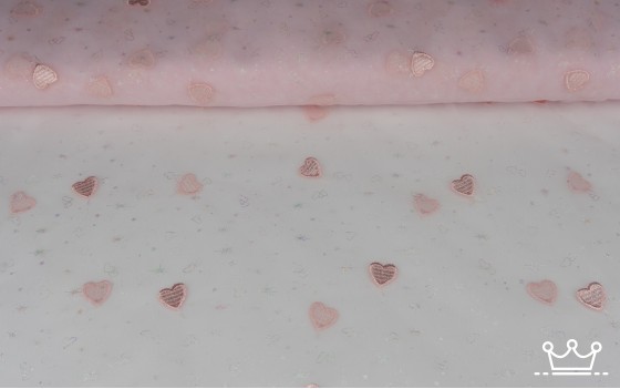 Deze mesh stof is een soepel vallende polyester stof met gaatjes wat hem doorschijnend maakt afgewerkt met geborduurde hartjes en wat glitter folie.