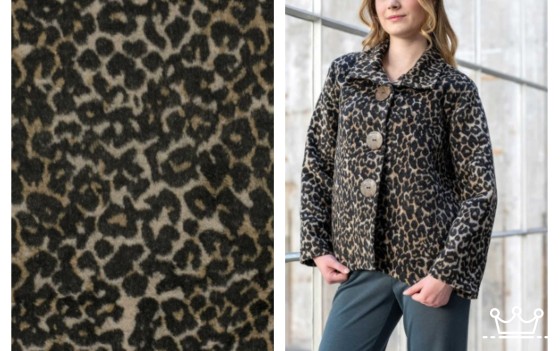 Polyester jacquard stof met luipaardprint in de kleuren camel en zwart. Deze stof is gemaak van 100% polyester.