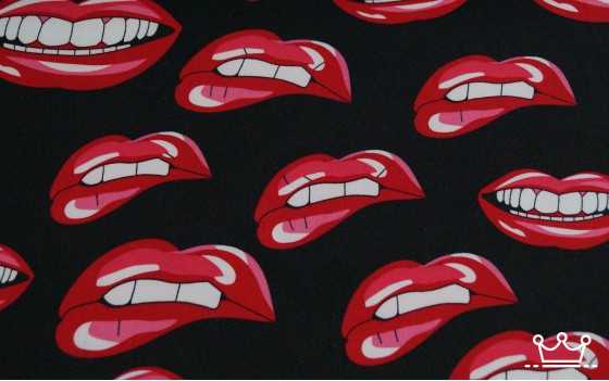 Scuba zwart met lippen is een mooie kwaliteit stof gemaakt van 85% polyester 10% viscose en 5% elesthaan. Deze stof is soepel en mooi vallend. Het is een stof met stretch waardoor hij mee rekt. Door de polyesther verkleurd de stof niet en kreukt hij ook niet!