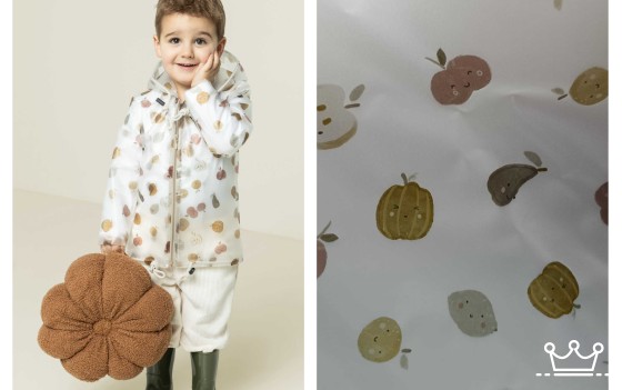 Vrolijke transparante regenjas-stof bedrukt met een speelse print van fruit. Deze stof is ideaal voor creatieve, waterdichte projecten zoals regenjasjes, poncho’s, tasjes, slabben, schorten of fietsaccessoires voor kinderen.