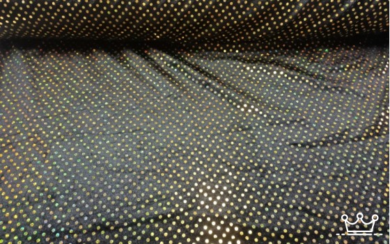 Velours de panne zwart met gouden paillet is een mooie kwaliteit stof van 100%polyester. Velours de panne is een rekbare soepel vallende, kreukvrije en kleurvaste stof met vleug en een glans omdat er nog een paillet op gedrukt zit heeft deze een extra chique uitstraling. LET OP!: de pailletten zijn met lijm op de stof geplakt deze zullen bij te hoge temperaturen en in de droger los laten! deze stof mag dus alleen op de hand gewassen worden.